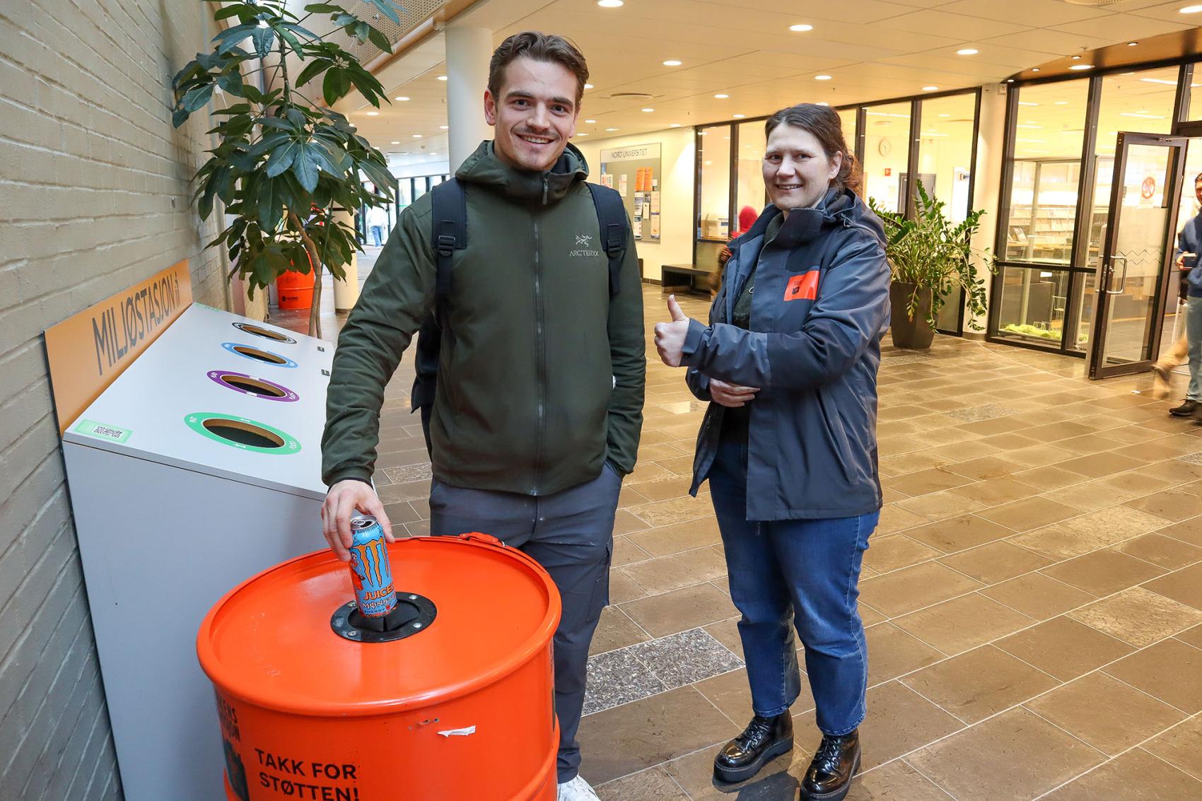 Tommel opp: Politistudent Erlend Skår panter sitt tomgods. Noe Susanne Breivik Jakobsen gir tommelen opp for. Skår synes dunkene er så flotte at han håper de også kommer til politihøgskolen. Foto: Lise Fagerbakk