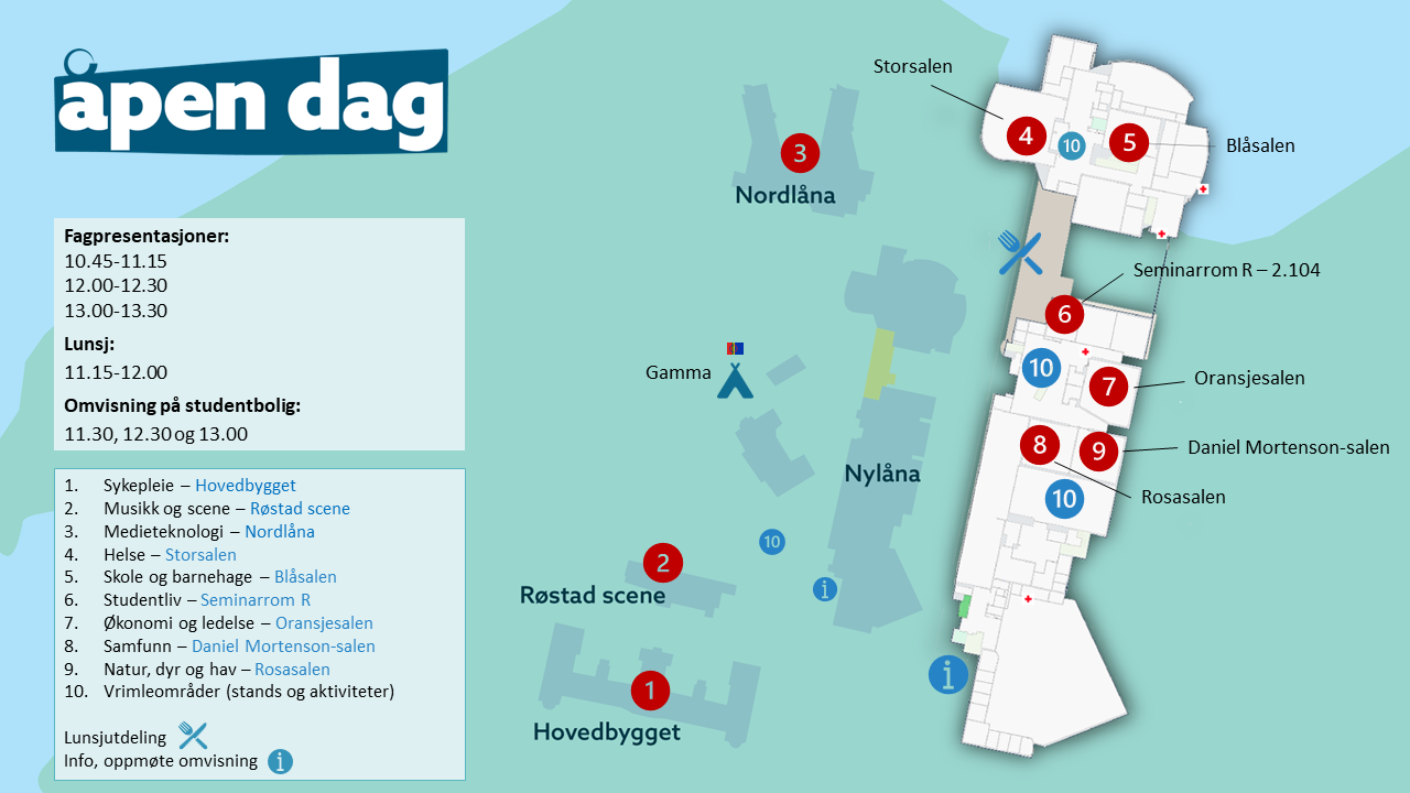 Lurer du på noe underveis i dagen, spør en av våre verter (gule vester) som går rundt på campus. Trenger du å snakke med oss som organiserer åpen dag, kan du ringe: