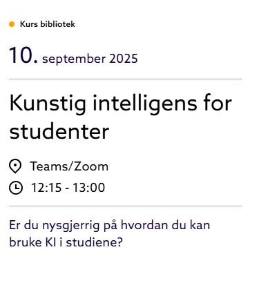 Det skal ikke henvises til generativ kunstig intelligens som en troverdig kilde i faglig arbeid. Tekst som lages av generativ kunstig intelligens må alltid verifiseres gjennom andre kilder.